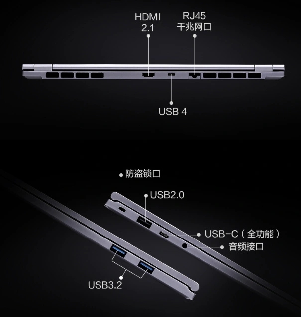 无界14X 锐龙版的接口非常全面且合理,分布在机身尾部与两侧,尾部接口是日常使用中不利于理线的HDMI2.1、USB4和RJ45千兆有线网口。机身两侧则具备了需要经常插拔的两个USB3.2 Type-A、一个USB2.0 Type-A、一个全功能USB Type-C。如此的三面接口布局让无界14X 锐龙版在日常使用中为用户提供更佳的便利性。